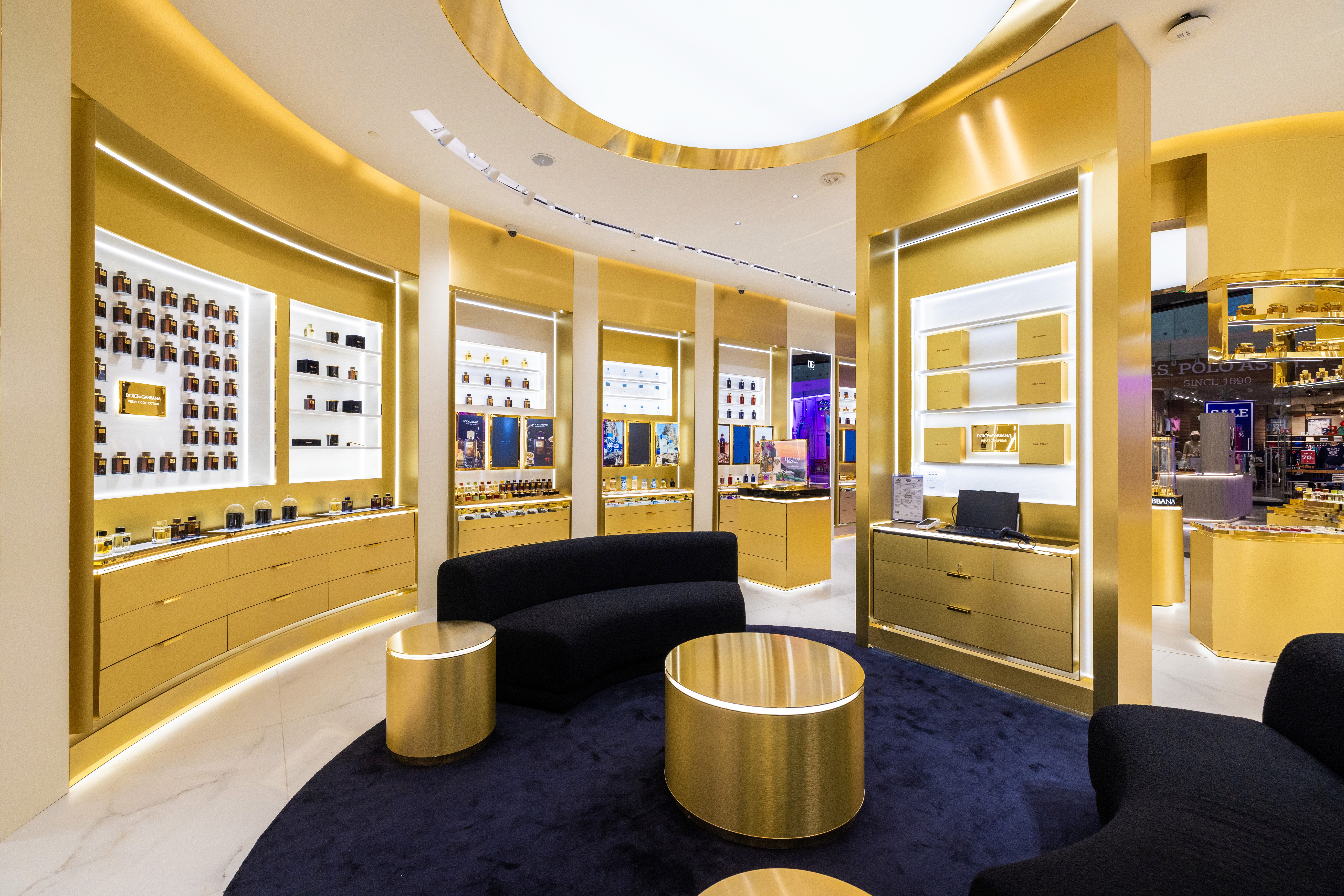 The project is conceived as an immersive and highly recognizable spatial system, where continuous golden surfaces, integrated lighting and curved geometries define a cohesive customer journey. The layout is organized around a central axis, articulated through freestanding display units and perimeter backwalls that balance product density with visual clarity. Large circular ceiling elements act as focal points, reinforcing spatial hierarchy while enhancing the perception of depth and fluidity. Particular attention is given to the integration of lighting within architectural elements, transforming display units into illuminated frames that elevate the product and ensure consistency across the space. The result is a controlled yet expressive environment, where architecture and merchandising operate as a single system to communicate a strong and distinctive identity.